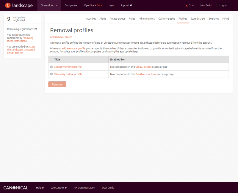 A removal profile defines a maximum number of days that a computer can go without exchanging data with the Landscape server before it is automatically removed. If more days pass than the profile's "Days without exchange", that computer will automatically be removed and the license seat it held will be released. This helps Landscape keep license seats open and ensure Landscape is not tracking stale or retired computer data for long periods of time. You can associate zero or more computers with each removal profile via tags to ensure those computers are governed by this removal profile. You can also associate a removal profile with an access group, which limits its use to only computers within the specified access group. You can manage removal profiles from the REMOVAL PROFILES link in the choice under your account.